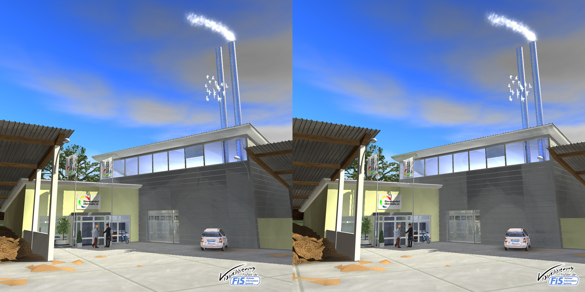 Die folgenden Bilder ermöglichen, die Gebäude 3-dimensional zu sehen. Sie sind als Crossview oder Kreuzblick-Bilder generiert. Um sie 3-dimensional zu sehen, muss man so schielen, dass man 3 Bilder sieht. Das Bild in der Mitte ist dann das 3D-Bild!